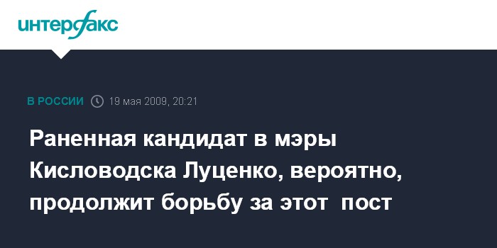 Ставрополь. 19 мая. INTERFAX.RU - Покушение на жизнь кандидата в мэры Кисловодска Натальи Луценко не должно стать для нее препятствием в борьбе за этот пост, считают в предвыборном штабе Луценко.