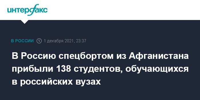 Москва. 1 декабря. INTERFAX.RU - Первая группа афганских студентов российских вузов прибыла в аэропорт Чкаловский, спецбортом смогли приехать 138 студентов, сообщил глава Минобрнауки Валерий Фальков.