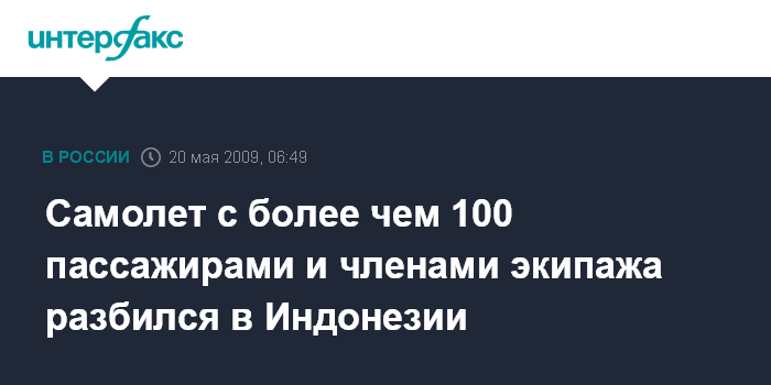 Москва. 20 мая. ИНТЕРФАКС - Военно-транспортный самолет разбился в Индонезии при перелете из столицы страны Джакарты в восточную часть острова Ява, сообщает утром в среду российский телеканал "Вести".