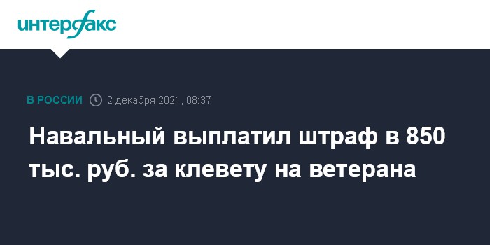 Москва. 2 декабря. INTERFAX.RU - Оппозиционер Алексей Навальный выплатил штраф в 850 тысяч руб., назначенный ему по приговору о клевете на ветерана Великой Отечественной войны Игната Артеменко, сообщили "Интерфаксу" в пресс-службе Бабушкинского суда Москвы.