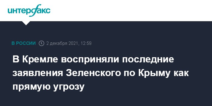 Москва. 2 декабря. INTERFAX.RU - Последние заявления президента Украины Владимира Зеленского по теме возвращения Крыма являются прямой угрозой в адрес России, заявил пресс-секретарь президента РФ Дмитрий Песков.