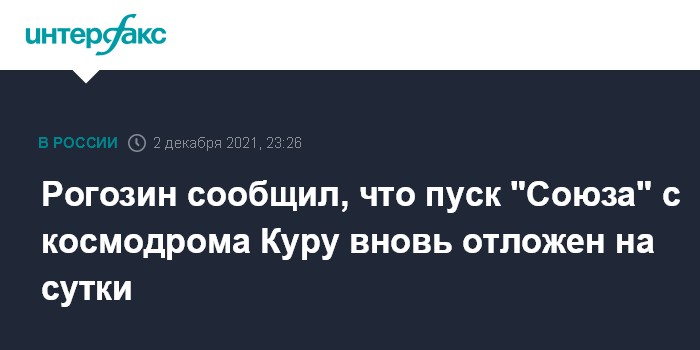 Москва. 2 декабря. INTERFAX.RU - Пуск ракеты-носителя "Союз" с навигационными спутниками Galileo вновь перенесен на сутки, с подобной просьбой обратилась французская сторона, сообщил глава "Роскосмоса" Дмитрий Рогозин.