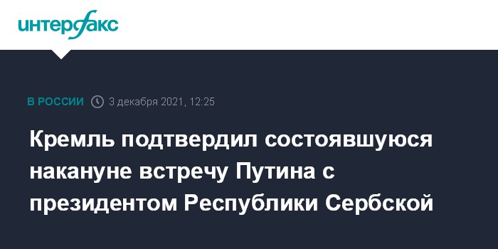 Москва. 3 декабря. INTERFAX.RU - Президент РФ Владимир накануне провел встречу с членом президиума Боснии и Герцеговины (БиГ) от Республики Сербской Милорадом Додиком, сообщил пресс-секретарь российского лидера Дмитрий Песков.