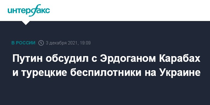 Москва. 3 декабря. INTERFAX.RU - Президенты России и Турции, Владимир Путин и Реджеп Тайип Эрдоган провели телефонный разговор. Лидеры двух стран обсудили развитие турецко-российских отношений и кризис между Арменией и Азербайджаном, Украину, Ливию и Сирию.