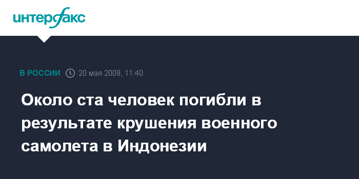 Москва. 20 мая. INTERFAX.RU - Не менее 97 человек стали жертвами катастрофы военно-транспортного самолета "Геркулес С-130" ВВС Индонезии, который разбился в ночь на среду в индонезийской провинции Восточная Ява. С таким заявлением выступила в среду пресс-служба ВВС страны.