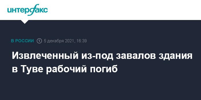 Москва. 5 декабря. INTERFAX.RU - Извлеченный из-под завалов здания бывшего комбината "Туваасбест" рабочий погиб, сообщает глава Тувы Владислав Ховалыг в соцсетях.