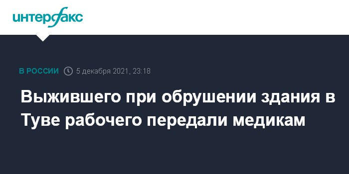 Москва. 5 декабря. INTERFAX.RU - Пострадавший при обрушении неэксплуатируемого здания на территории горно-обогатительного комбината Туваасбест извлечен из-под обломков и передан медикам, сообщает пресс-служба МЧС РФ.
