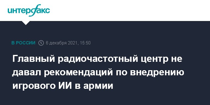 Москва. 6 декабря. INTERFAX.RU - Главный радиочастотный центр (ГРЧЦ), подведомственный Роскомнадзору, не давал каких-либо рекомендаций по внедрению в российских вооруженных искусственного игрового интеллекта, сообщил "Интерфаксу" руководитель Научно-технического центра ГРЧЦ Александр Федотов.