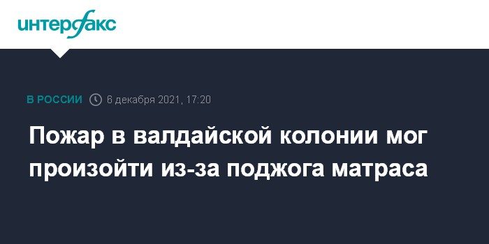 Москва. 6 декабря. INTERFAX.RU - Причиной пожара в исправительной колонии в Валдае Новгородской области, согласно предварительным данным, стал поджог, сообщила в понедельник "Интерфаксу" представитель регионального управления Следственного комитета Анастасия Садриева.