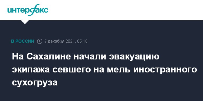 Москва. 7 декабря. INTERFAX.RU - Экипаж сухогруза Xing Yuan, севшего на мель возле набережной города Холмска на юго-западном побережье Сахалина, снимают с борта судна с помощью троса, сообщили "Интерфаксу" в пресс-службе ГУ МЧС региона.
