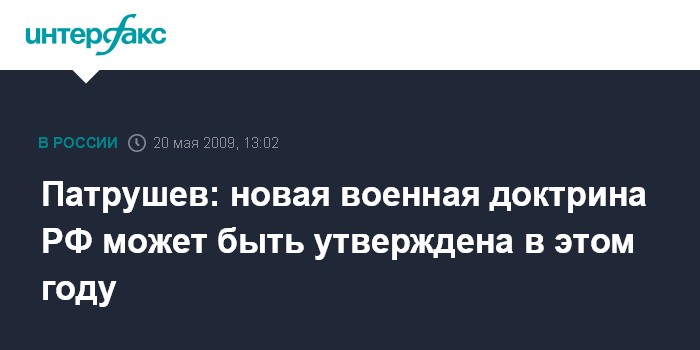 Москва. 20 мая. INTERFAX.RU - Новую военную доктрину РФ планируется утвердить в этом году, сообщил "Интерфаксу" в среду секретарь Совета безопасности РФ Николай Патрушев. "В этом году", - сказал Н.Патрушев, отвечая на вопрос о том, когда будет утвержден документ.