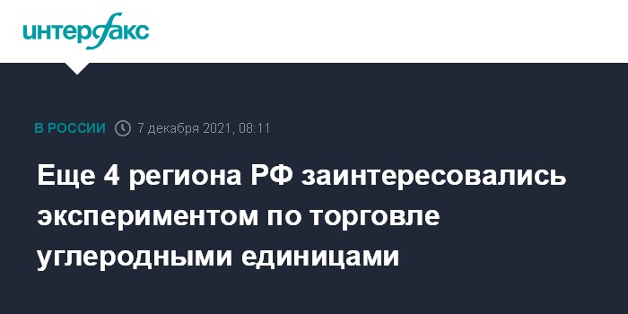 Москва. 7 декабря. INTERFAX.RU - Республика Башкортостан, Хабаровский край и Иркутская и Калининградская области выразили заинтересованность в проведении на их территории эксперимента по торговли углеродными единицами, а также формированию системы учета выбросов и поглощений парниковых газов, сообщила пресс-служба вице-премьера Виктории Абрамченко, курирующей экологию.