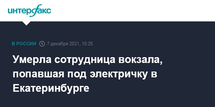 Москва. 7 декабря. INTERFAX.RU - Сотрудница вокзала, которую на железнодорожной станции в Екатеринбурге во вторник сбил поезд, получила смертельную травму.