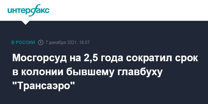 Москва. 7 декабря. INTERFAX.RU - Мосгорсуд сократил с семи лет до 4,5 года срок лишения свободы бывшему главному бухгалтеру "Трансаэро" Андрею Ковалеву по делу о хищении денег у авиакомпании, сообщили "Интерфаксу" в пресс-службе суда.
