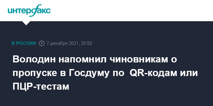 Москва. 7 декабря. INTERFAX.RU -Для прохода в Госдуму все, включая депутатов и чиновников, должны будут иметь либо QR-код либо справки ПЦР, заявил журналистам спикер палаты Вячеслав Володин.