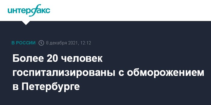 Москва. 8 декабря. INTERFAX.RU - Более 20 человек были доставлены в НИИ скорой помощи имени Джанелидзе с диагнозом "обморожение" после прихода морозной погоды в Петербург, сообщается в среду в телеграм-канале городского комитета здравоохранения.