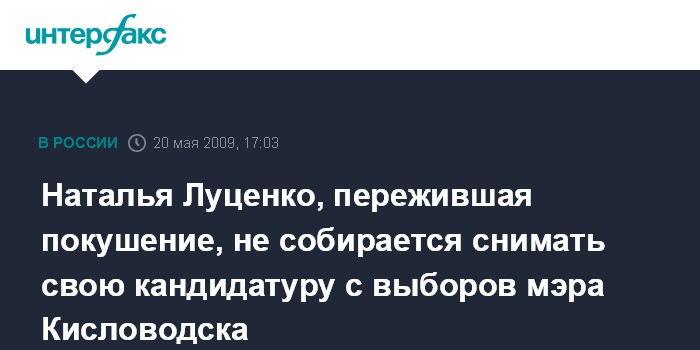 "Получив ранения в результате покушения, она, тем не менее, не изменила своих позиций и не собирается снимать свою кандидатуру (с выборов мэра Кисловодска - ИФ)", - сообщается в пресс-релизе. Отмечается, что позиция Луценко "заслуживает самого искреннего уважения".