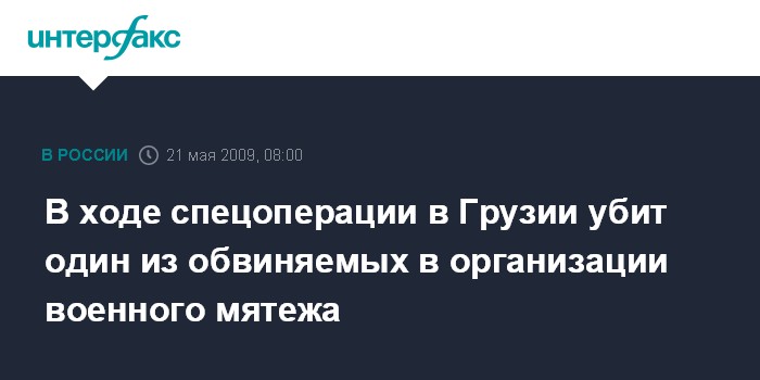 Москва. 21 мая. INTERFAX.RU - В Грузии в результате спецоперации убит один из обвиняемых в организации военного мятежа 5 мая в Мухрованской военной части Минобороны, еще два человека, разыскивавшихся по этому делу, ранены, сообщает МВД. Все трое разыскивались по обвинению в организации военного мятежа 5 мая в Мухрованской военной части Минобороны Грузии, подчеркнули в МВД.
