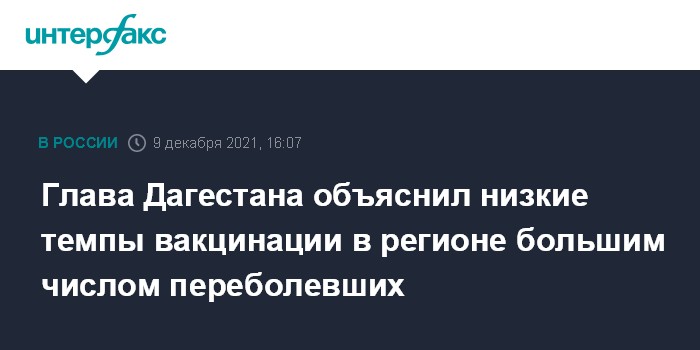 Москва. 9 декабря. INTERFAX.RU - Глава Дагестана Сергей Меликов заявил, что регион занимает последнее место в РФ по темпам вакцинации от коронавируса, но это связано с высоким уровнем естественного иммунитета.