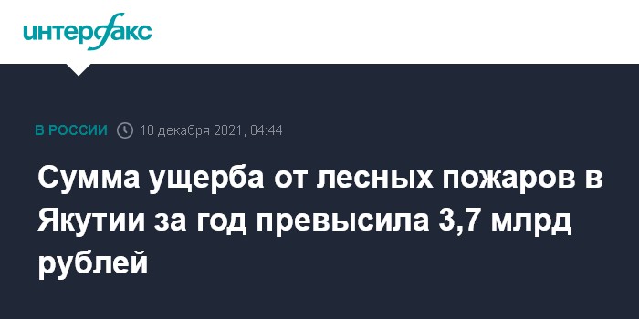 Москва. 10 декабря. INTERFAX.RU - Больше 1,7 тыс. лесных пожаров зарегистрировали в Якутии в 2021 году, сумма ущерба составила более 3,7 млрд рублей, сообщает в пятницу пресс-служба прокуратуры региона.
