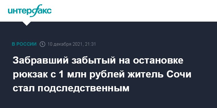 Москва. 10 декабря. INTERFAX.RU - В Сочи пассажир автобуса забыл на остановке рюкзак, в котором были документы и 1 млн рублей. Когда он вернулся к остановке, рюкзака там уже не было. По факту возбудили уголовное дело, в краже подозревается 22-летний безработный горожанин, сообщили в управлении МВД по Кубани.