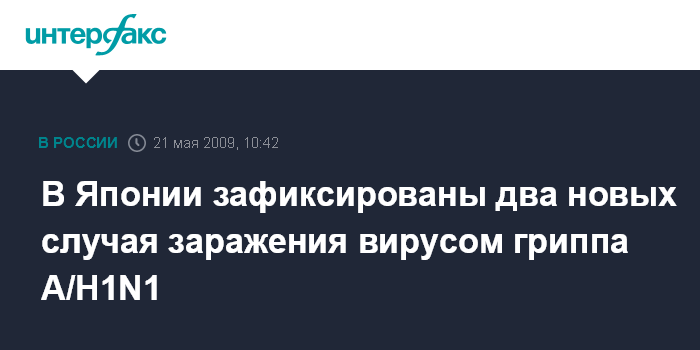 Москва. 21 мая. INTERFAX.RU - В Токио подтверждены два новых случая заражения вирусом гриппа A/H1N1, таким образом количество заболевших в Японии достигло 267 человек, заявили в четверг представители городских властей.