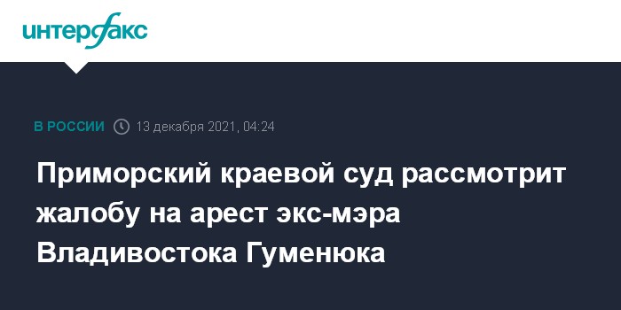 Как сообщалось, Фрунзенский районный суд во Владивостоке продлил экс-мэру Владивостока Олегу Гуменюку срок содержания под стражей до 3 февраля 2022 года.