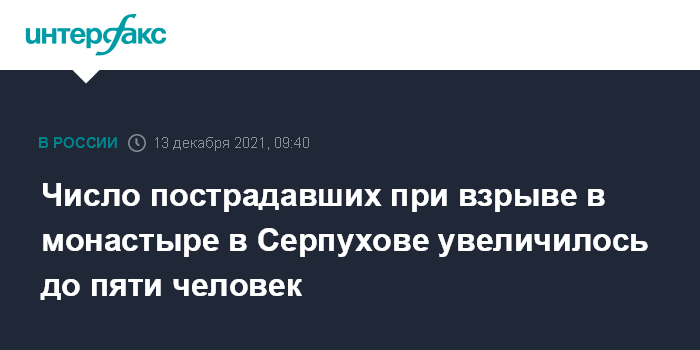 Москва. 13 декабря. INTERFAX.RU - Число пострадавших при взрыве в Серпуховском женском монастыре увеличилось до пяти человек, сообщил "Интерфаксу" информированный источник.