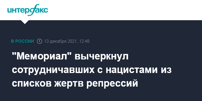 Москва. 13 декабря. INTERFAX.RU - Включение в списки жертв политических репрессий лиц, которые были причастны к работе нацистов, является ошибкой в базе данных международной общественной организации "Мемориал" (признана в РФ НКО-иноагентом), сообщили в ее правлении.