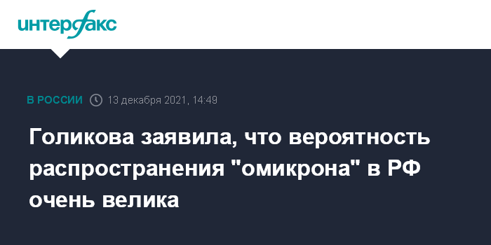 Москва. 13 декабря. INTERFAX.RU - Вице-премьер Татьяна Голикова считает, что вероятность распространения в РФ нового штамма коронавируса COVID-19 "омикрон" очень велика.