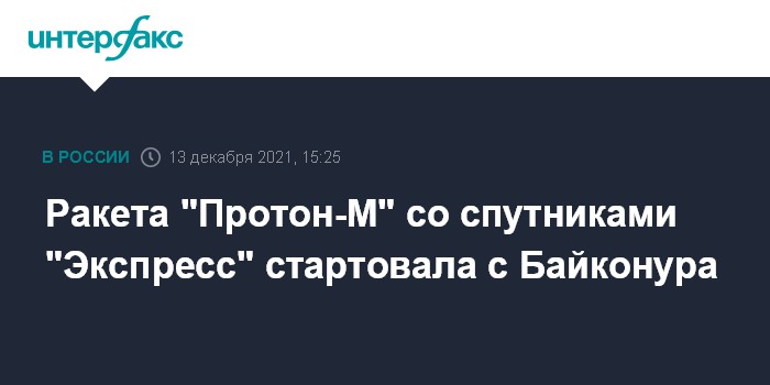 Москва. 13 декабря. INTERFAX.RU - Ракета-носитель "Протон-М" с телекоммуникационными спутниками "Экспресс-АМУ3" и "Экспресс-АМУ7" стартовала с космодрома Байконур, трансляцию запуска ведет "Роскосмос".