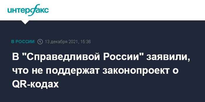 Москва. 13 декабря. INTERFAX.RU - Руководитель "Справедливой России - За Правду" Сергей Миронов заявил, что фракция не поддержит правительственный законопроект о введении QR-кодов для посещения общественных мест.