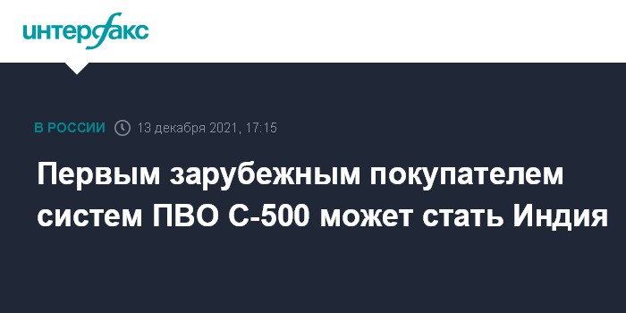 Москва. 13 декабря. INTERFAX.RU - Индия может стать первым иностранным покупателем новой системы ПВО С-500. Об этом сообщил вице-премьер Юрий Борисов в эфире телеканала "РБК-ТВ".