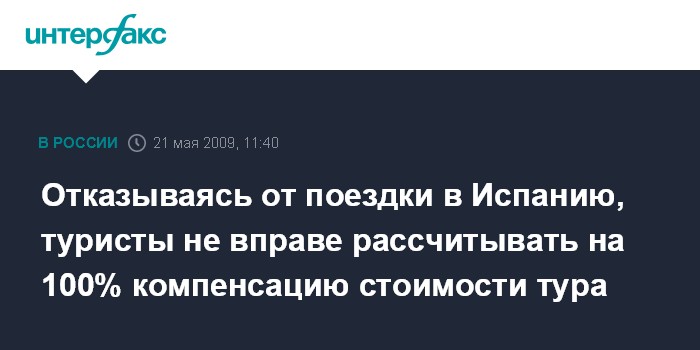 Москва. 21 мая. INTERFAX.RU – Отказываясь от поездок в Испанию со ссылкой на заявление главного санитарного врача России, туристы не вправе рассчитывать на стопроцентный возврат средств, сообщила в четверг исполнительный директор Ассоциации туроператоров России (АТОР) Майя Ломидзе.