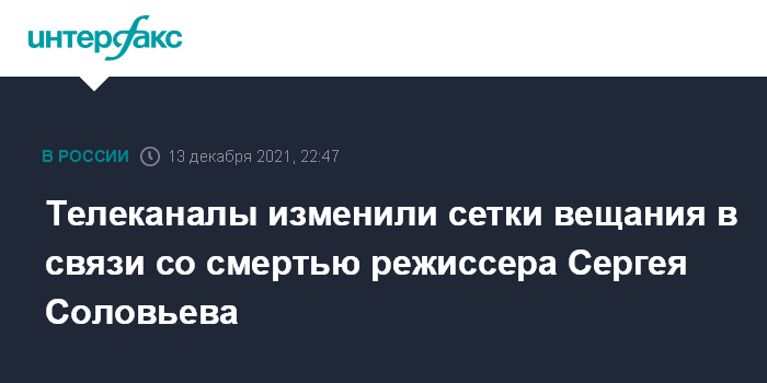 Москва. 13 декабря. INTERFAX.RU - Телеканалы изменили сетки вещания в связи со смертью советского и российского режиссера, сценариста и кинопродюсера Сергея Соловьева.