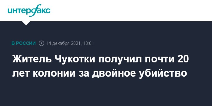 Москва. 14 декабря. INTERFAX.RU - Суд Чукотского автономного округа приговорил 35-летнего местного жителя к 19,5 годам заключения в колонии строгого режима за двойное убийство и другие преступления, сообщает во вторник региональная прокуратура.