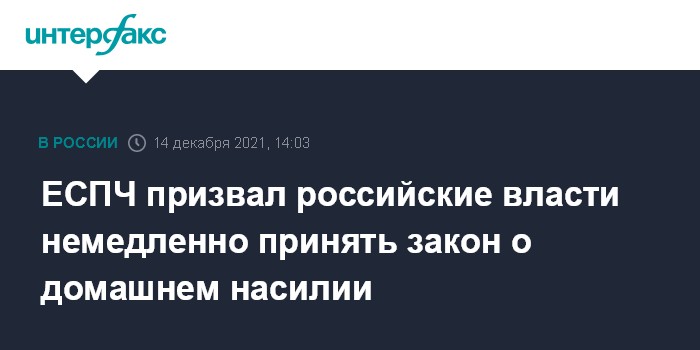 Москва. 14 декабря. INTERFAX.RU - Европейский суд по правам человека призвал российские власти без промедления ввести в законодательство понятие "домашнего насилия" и меры по его предотвращению и защите пострадавших от агрессоров. Об этом говорится в пресс-релизе суда в связи с вынесенным решением по искам четырех россиянок.