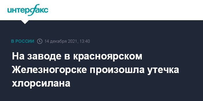 Москва. 14 декабря. INTERFAX.RU - Утечка с последующим испарением хлорсилана произошла на территории действующего Горно-химического комбината в Железногорске Красноярского края, сообщает пресс-служба ГУ МЧС по региону.