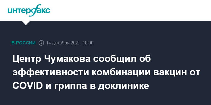 Москва. 14 декабря. INTERFAX.RU - Доклинические исследования комбинации вакцины от коронавируса и гриппа, которые проводил Центр имени Чумакова, показали хорошее взаимодействие и эффективность совместного применения вакцин. Об этом сообщил директор ФНЦ исследования и разработки иммунобиологических препаратов имени М.П. Чумакова РАН Айдар Ишмухаметов.