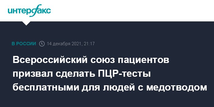 Всероссийский союз пациентов призвал сделать ПЦР-тесты бесплатными для людей с медотводом