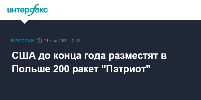 Лондон. 21 мая. INTERFAX.RU - Американские зенитно-ракетные комплексы "Пэтриот", а также 100 военнослужащих США будут размещены в Польше к концу года, несмотря на негативную реакцию России, сообщает газета Financial Times со ссылкой на заявление заместителя министра обороны Польши Станислава Коморовского.