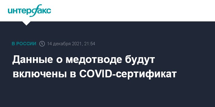 Москва. 14 декабря. INTERFAX.RU - В "ковидных" сертификатах в скором времени появятся данные о временном или постоянном медицинском отводе, сообщила вице-премьер РФ Татьяна Голикова.
