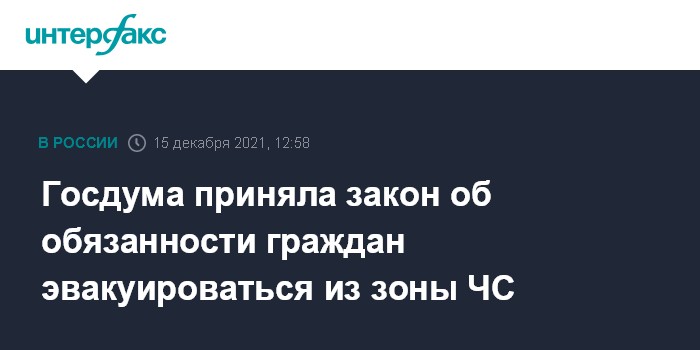 Москва. 15 декабря. INTERFAX.RU - Депутаты Госдумы приняли в третьем чтении законопроект, который обязывает граждан покидать зону чрезвычайной ситуации или угрозы ЧС, если власти объявят эвакуацию.
