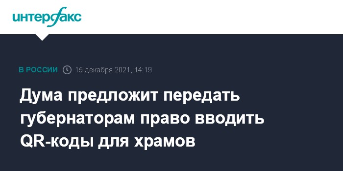 Москва. 15 декабря. INTERFAX.RU - Госдума предложит правительству решить вопрос, будет ли закон о доступе в общественные места по QR-кодам регулировать посещение религиозных организаций. Это говорится в проекте постановление, который планируется принять одноверменно с первым чтением законопроекта 16 декабря.
