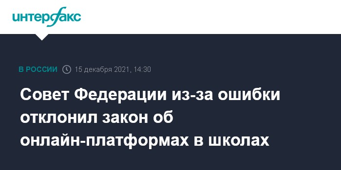 Москва. 15 декабря. INTERFAX.RU - Совет Федерации отклонил принятый Госдумой закон об онлайн-образовании из-за допущенной в нем при втором чтении технической ошибки.