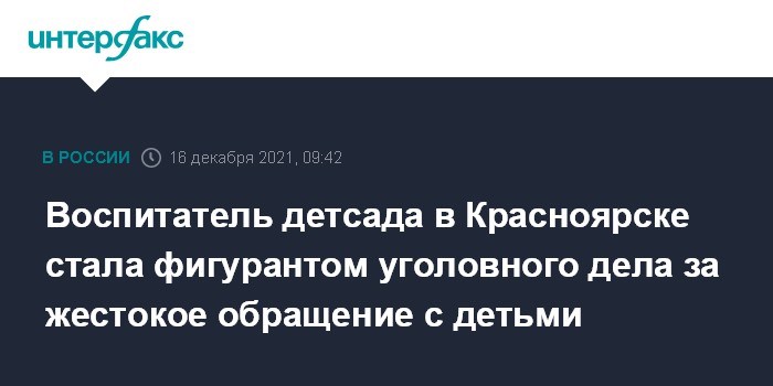 Москва. 16 декабря. INTERFAX.RU - В Красноярске в отношении воспитательницы детского садика № 315 возбуждено уголовное дело о ненадлежащем исполнении обязанностей педагогическим работником в сочетании с жестоким обращением (ч. 1 ст. 156 УК), сообщили в краевом управлении Следственного комитета. На воспитательницу пожаловались родители.