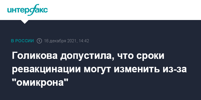 Москва. 16 декабря. INTERFAX.RU - Из-за распространения штамма коронавирусной инфекции "омикрон" могут быть скорректированы сроки прохождения ревакцинации гражданами, на данный момент информация изучается, сообщила вице-премьер РФ Татьяна Голикова.