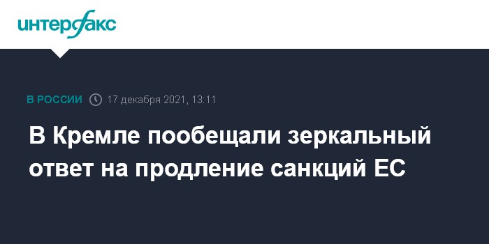 Москва. 17 декабря. INTERFAX.RU - Россия примет зеркальные меры в ответ на решение Евросоюза продлить антироссийские санкции, введенные из-за Украины, заявил пресс-секретарь президента Владимира Путина Дмитрий Песков.