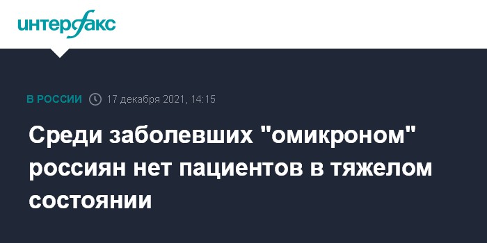 Москва. 17 декабря. INTERFAX.RU - Ни один из заболевших новым штаммом коронавируса "омикрон" россиян не переносит болезнь в тяжелой форме, сообщил глава Минздрава Михаил Мурашко.