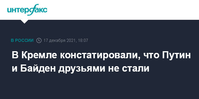 Москва. 17 декабря. INTERFAX.RU - Президентов РФ и США Владимира Путина и Джо Байдена нельзя назвать друзьями, но их общение носит взаимоуважительный и деловой характер, заявил пресс-секретарь российского лидера Дмитрий Песков.